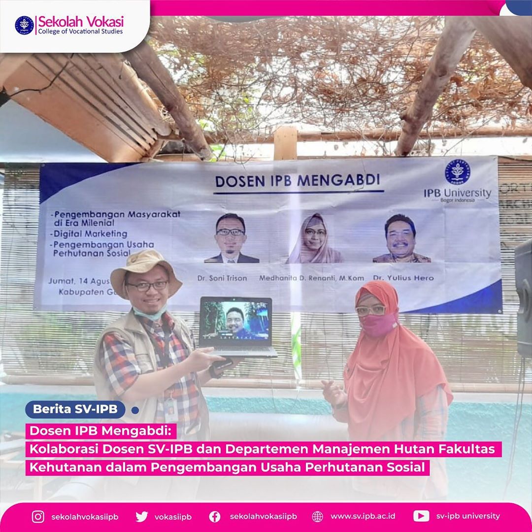 Dosen Program Studi Manajemen Informatika Sekolah Vokasi dan Departemen Manajemen Hutan Fakultas Kehutanan berkolaborasi melalukan pengabdian masyarakat untuk pengembangan usaha perhutanan sosial pada Jumat (14/8/2020) di LMDH Mandalagiri Desa Rancasalak, Kecamatan Kadungora. Kabupaten Garut dan Sabtu (15/8/2020) di tempat KKNT Mahasiswa IPB di Kelurahan Urug. Kecamatan Kawalu, Kota Tasikmalaya. Peserta yang hadir pada kegiatan ini yang dilaksanakan di Garut adalah para petani kopi yang ada di Desa Rancasalak, sementara itu di Tasikmalaya kegiatan ini diikuti oleh para wirausahawan termasuk wirausaha muda.